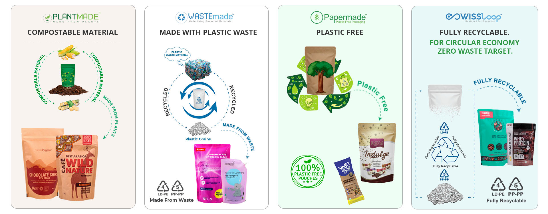 Swisspac provides innovative flexible packaging solutions including stand-up pouches, coffee bags, labels, sustainable packaging, and sealing machines trusted by global brands for over 40 years.